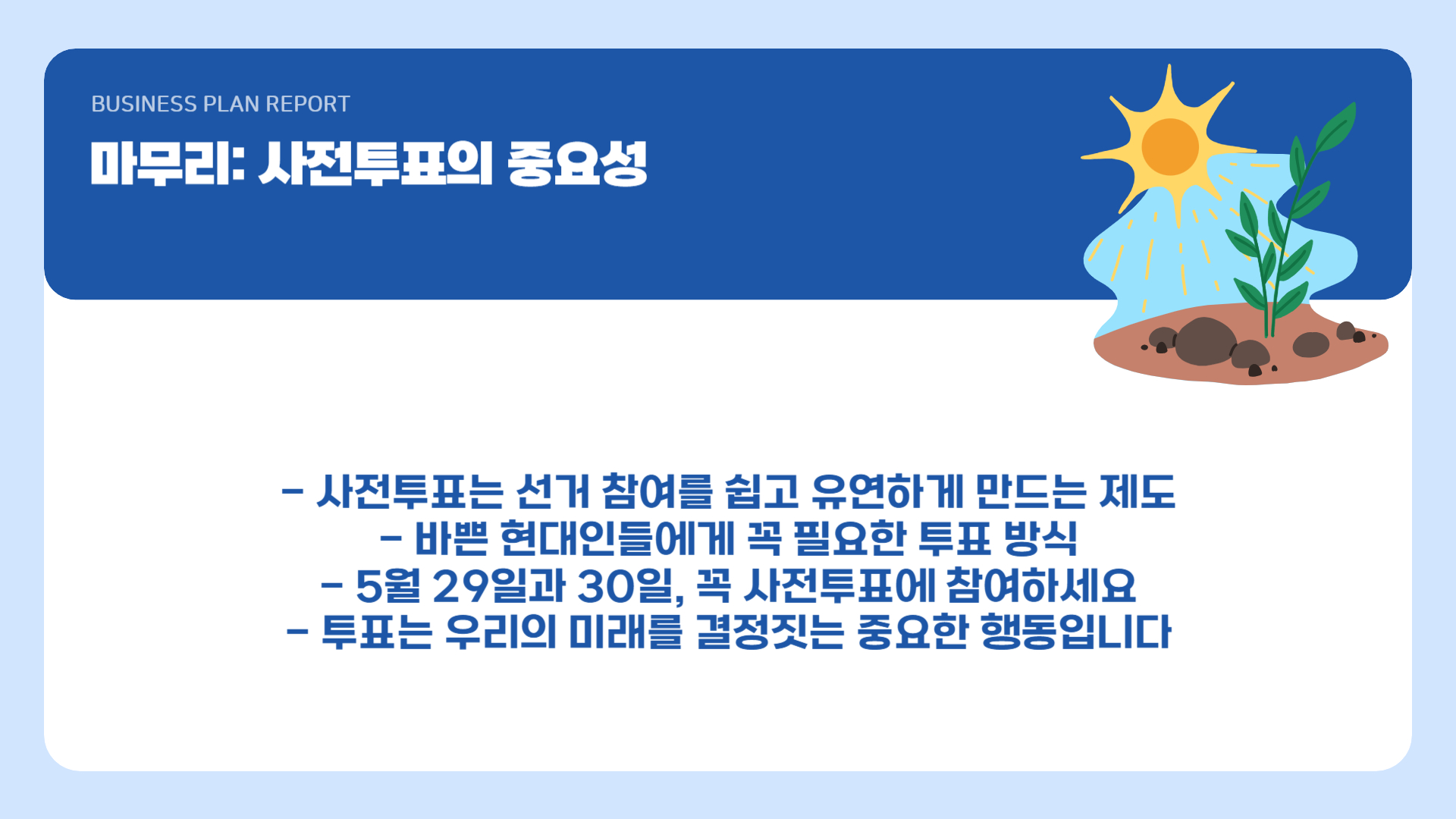 - 사전투표를 했으면 본투표에 다시 참여할 수 없습니다. 중복 투표는 불법입니다.