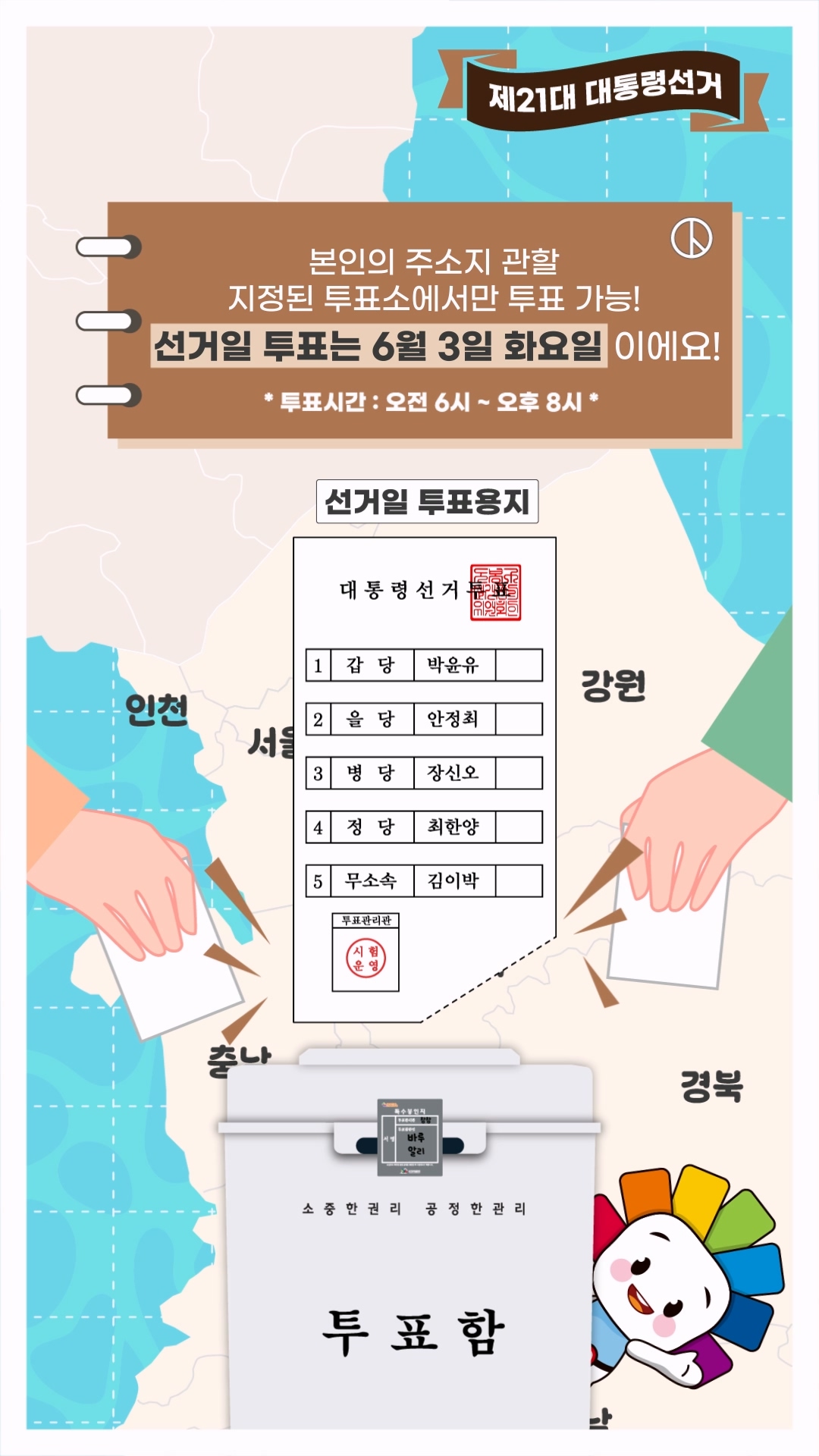 - 시간 외 도착 시 투표가 불가능하니 여유 있게 방문하세요.