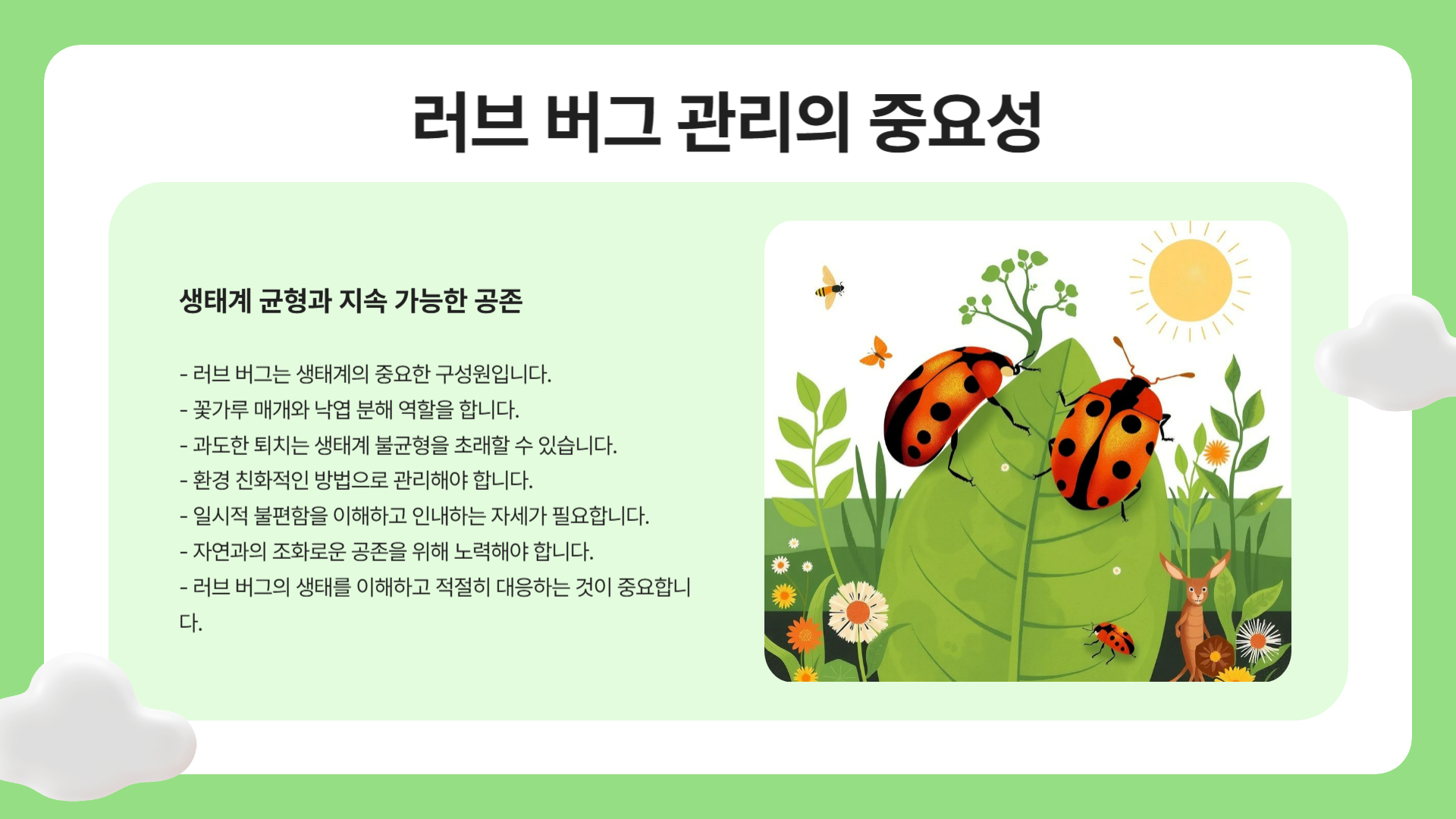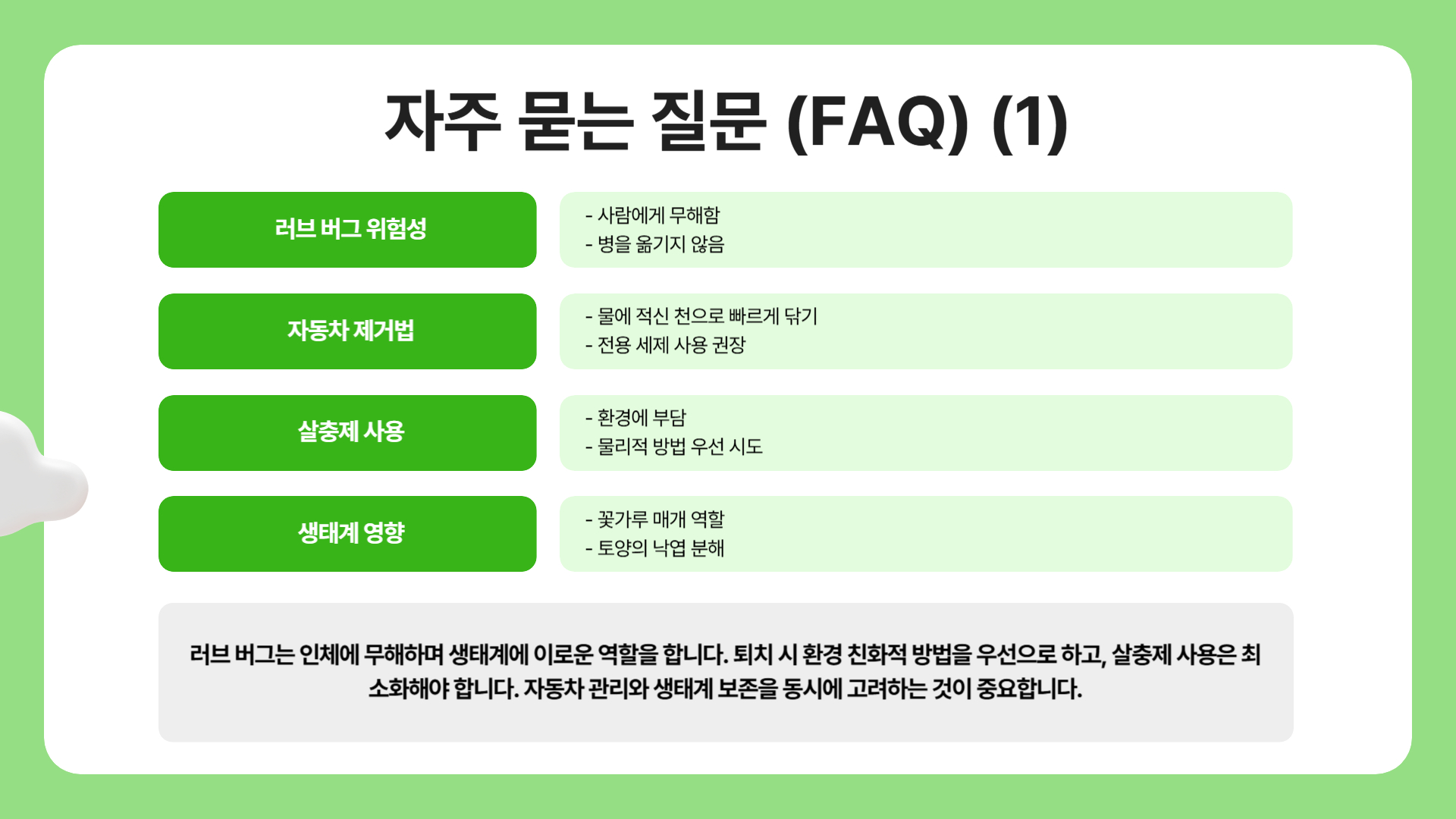 결론적으로, 러브 버그는 생태적으로는 유익한 익충이지만, 생활에 불편함을 줄 수 있으니 적절히 예방하고 퇴치하는 것이 좋습니다.
