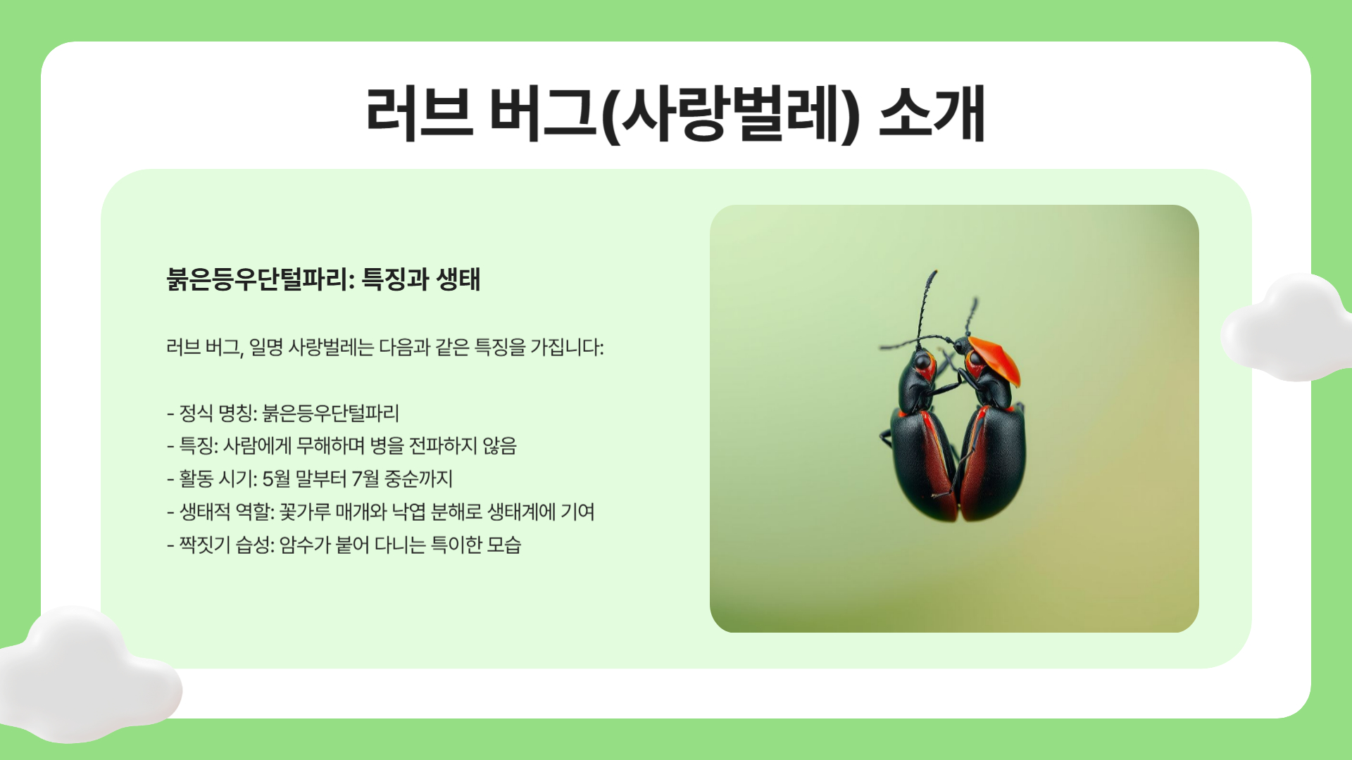 - 러브 버그(붉은등우단털파리)는 인체에 해롭지 않은 곤충으로, 사람을 물거나 질병을 옮기지 않습니다.