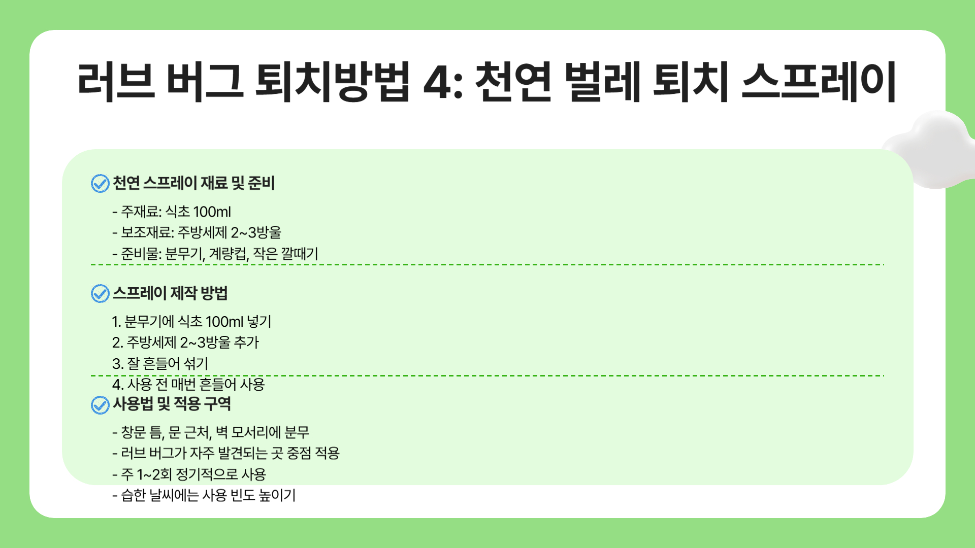 - 천연 스프레이는 주기적으로 뿌려주는 것이 가장 효과적입니다.