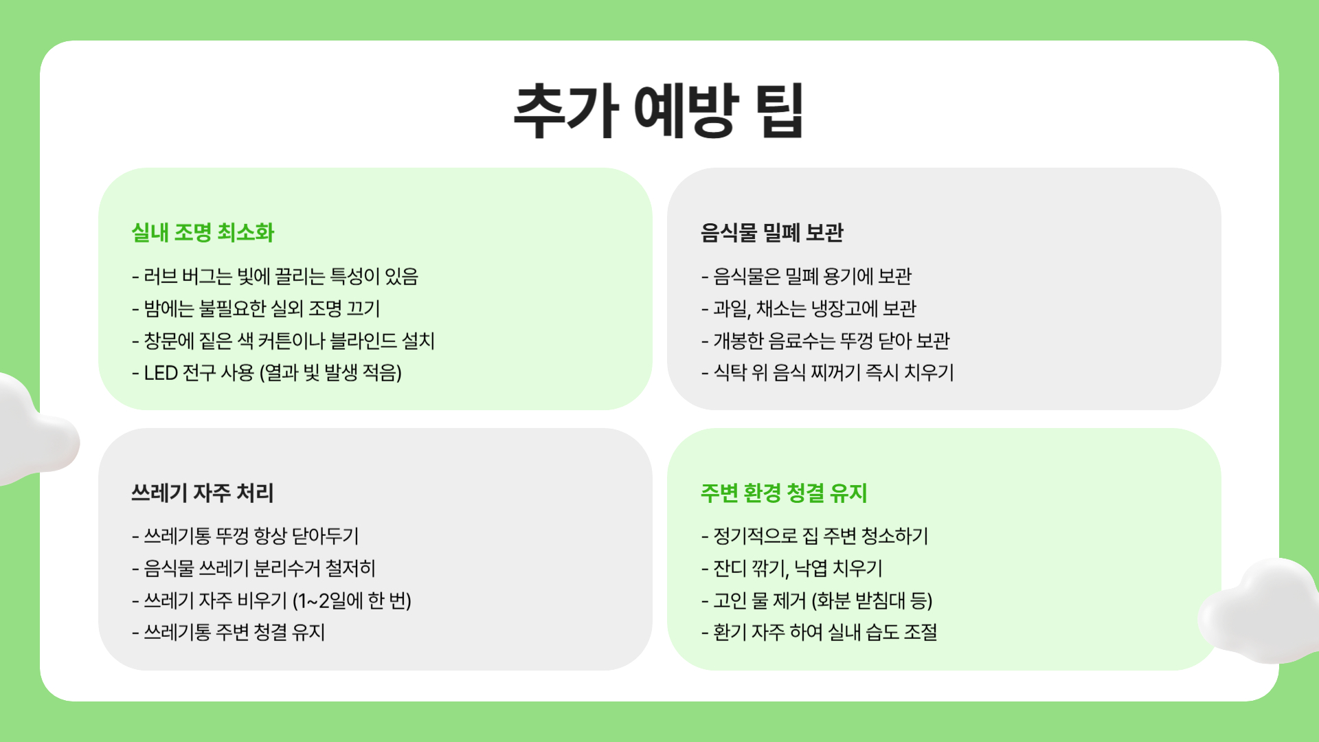 • 음식물을 실내에 오래 두지 않고 쓰레기 처리를 철저히 하는 것도 중요합니다.