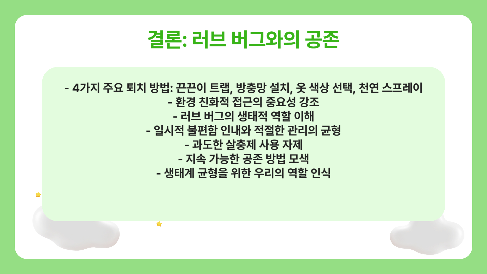 - 주변 환경 정리 : 습한 환경과 잡초는 러브 버그의 번식을 돕습니다. 집 주변을 건조하고 깔끔하게 유지하세요.