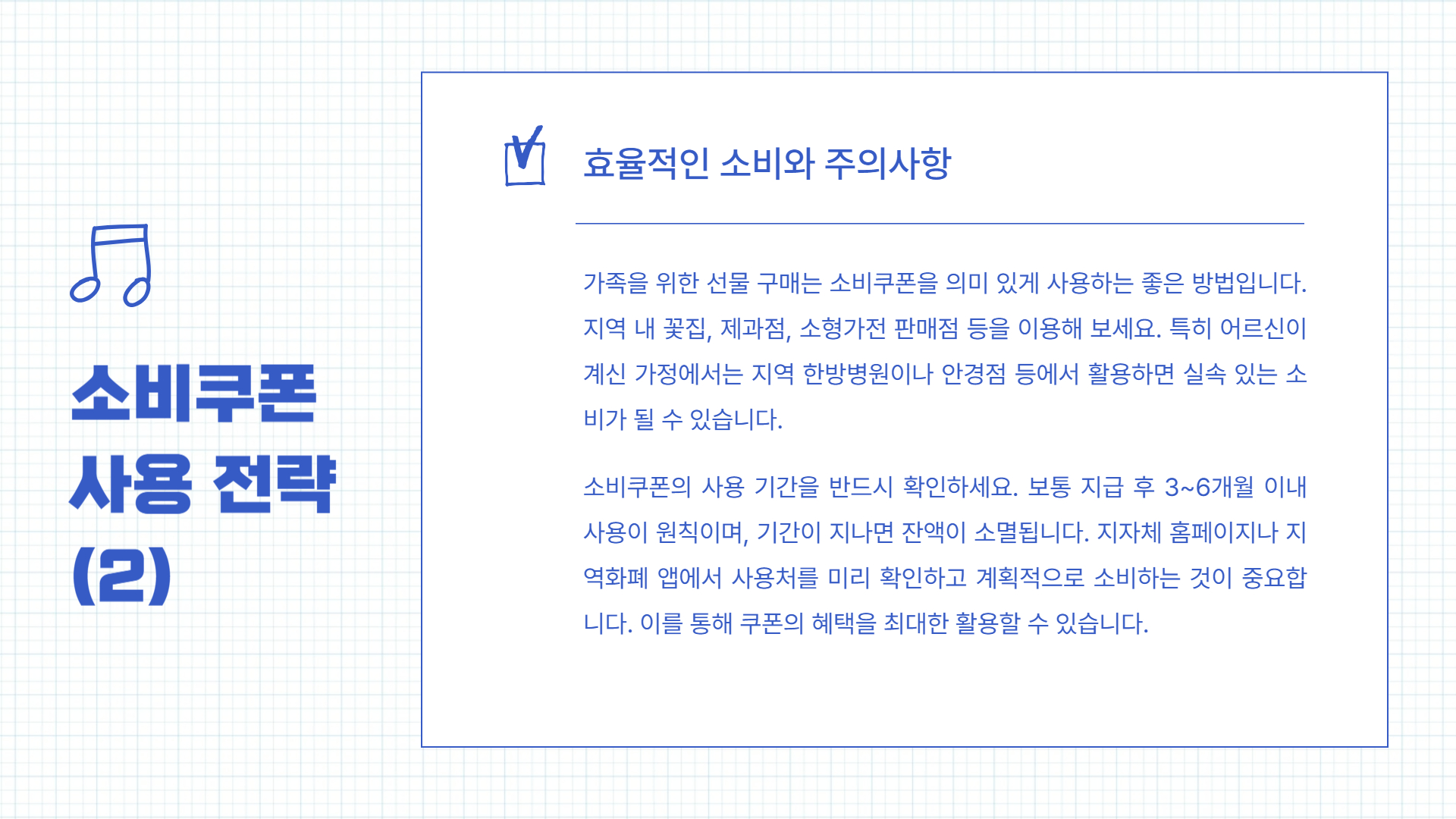 - 특히 어르신이 계신 가정에서는 지역 한방병원, 안경점 등에서 활용하면 실속 있는 소비가 됩니다.