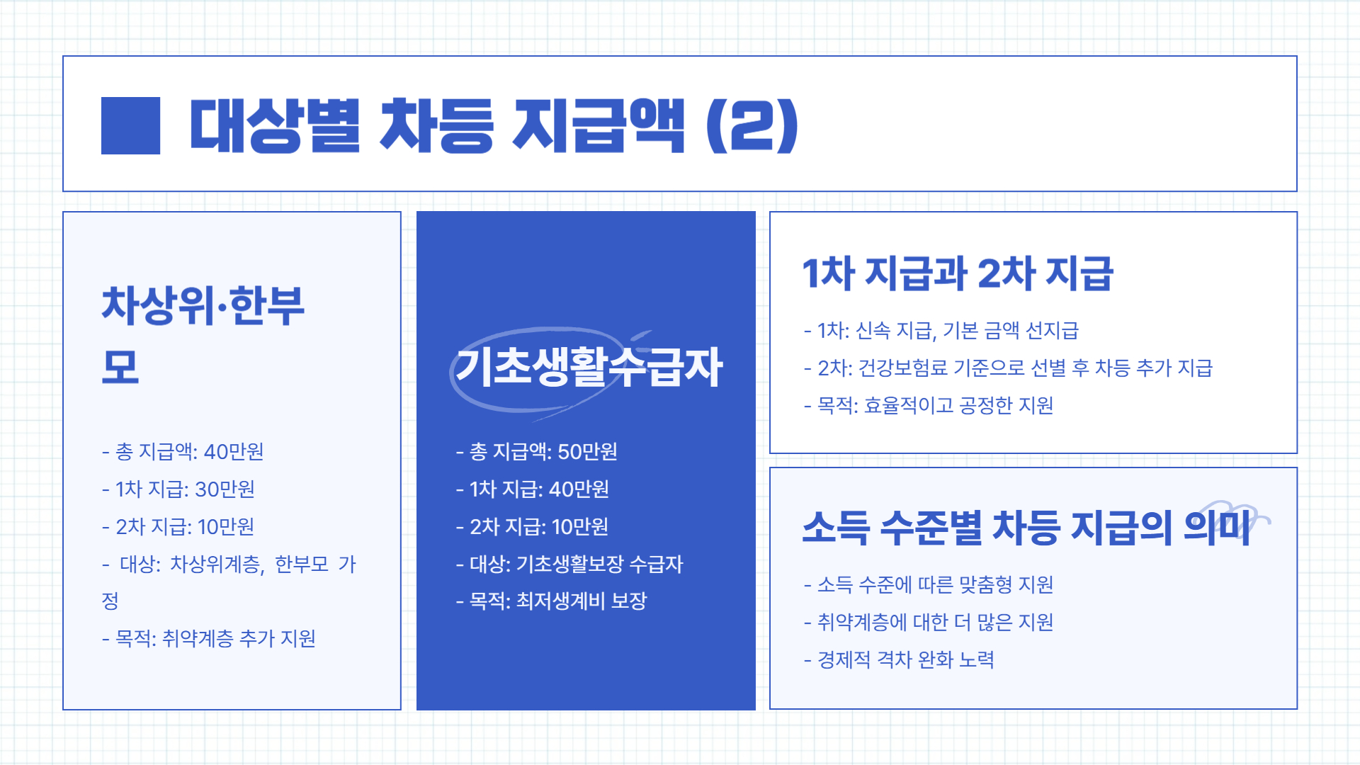 - 2차 지급(선별 지급): 건강보험료 기준으로 선별 후 차등 추가 지급