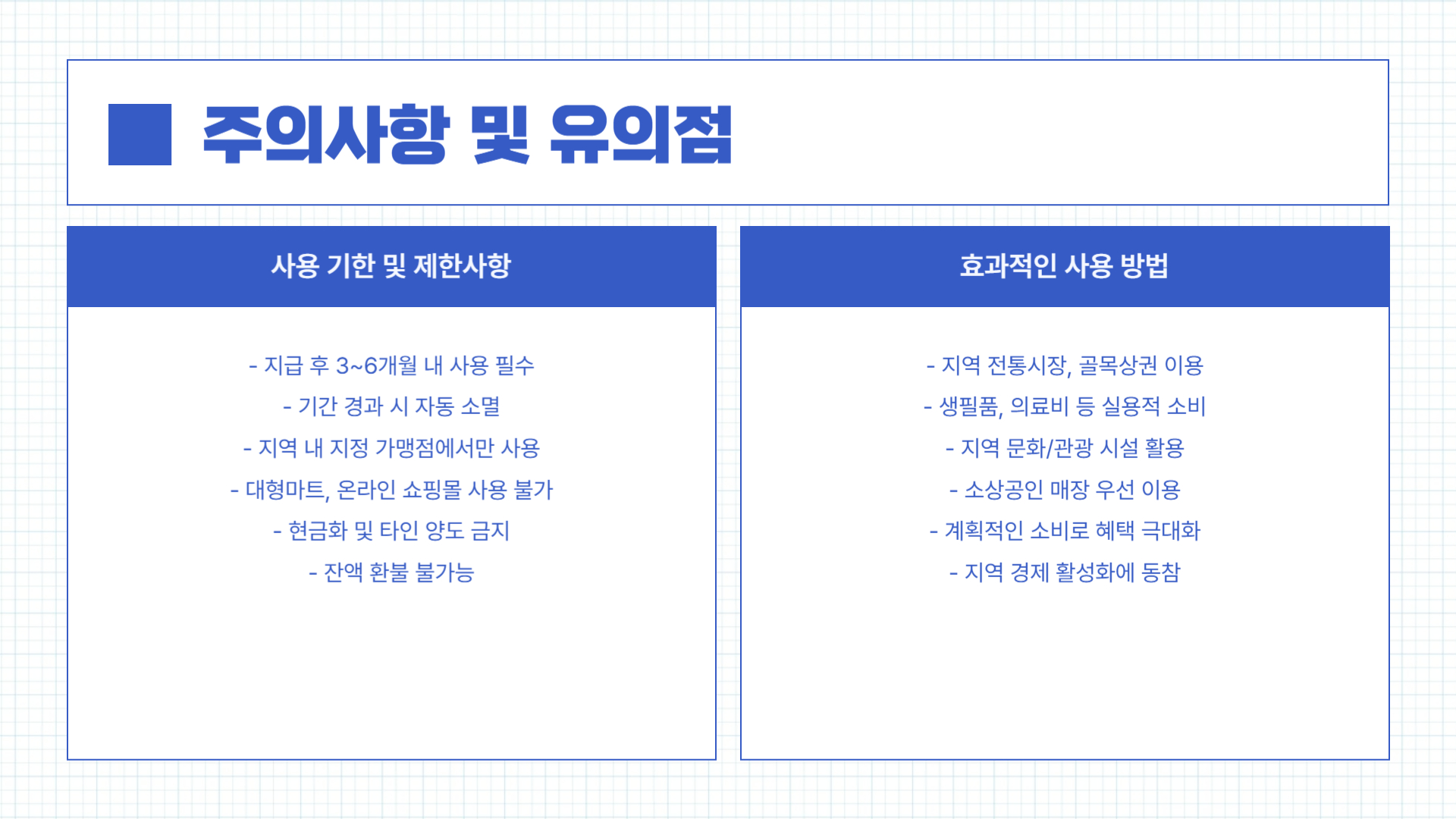- 대형마트(이마트, 홈플러스 등)나 백화점은 사용 불가인 경우가 많습니다.