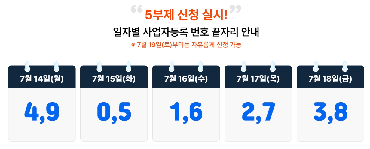 첫 주(7/14~7/18)는 사업자등록번호 끝자리에 따라 신청일이 정해져 있습니다.