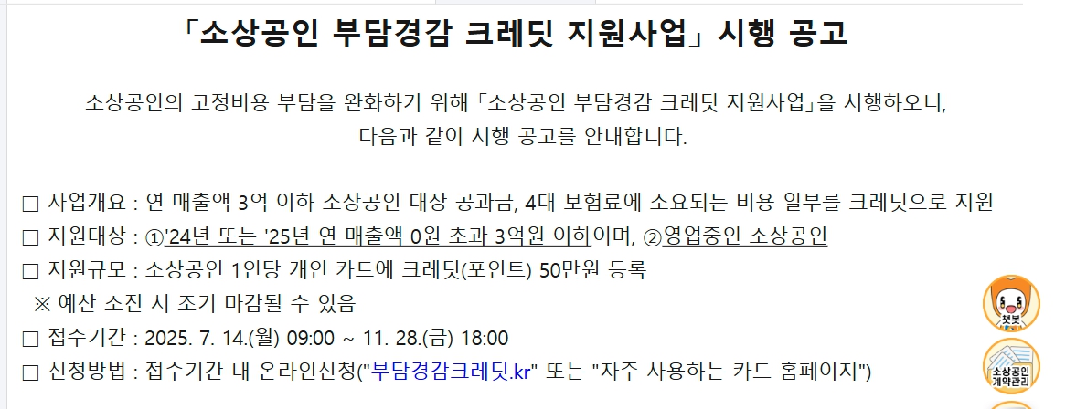 📢 소상공인 부담경감 크레딧으로 최대 50만 원의 혜택을 놓치지 마세요. 신청 기간과 방법을 다시 한번 확인하고 바로 신청하세요!