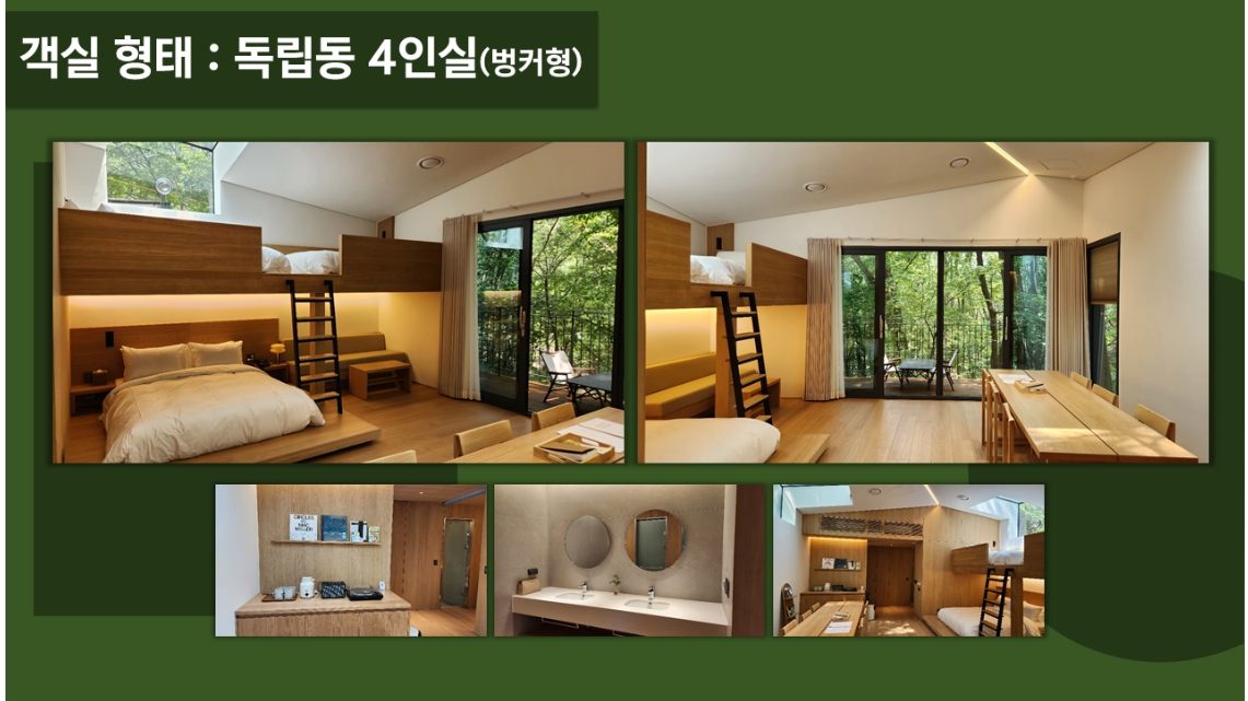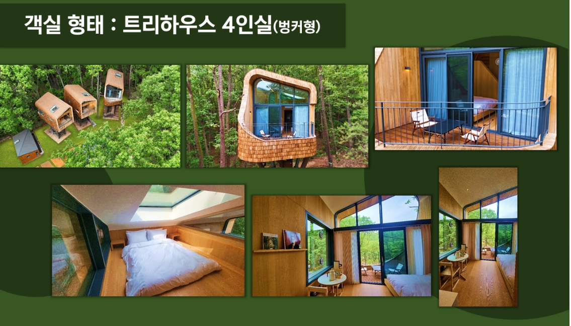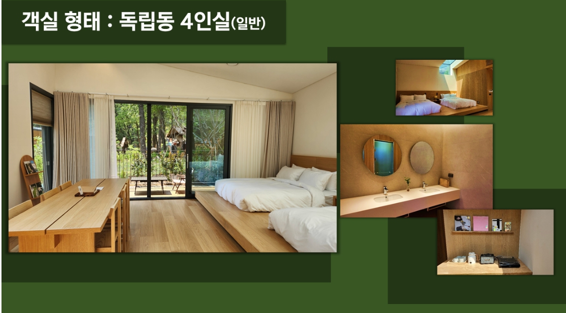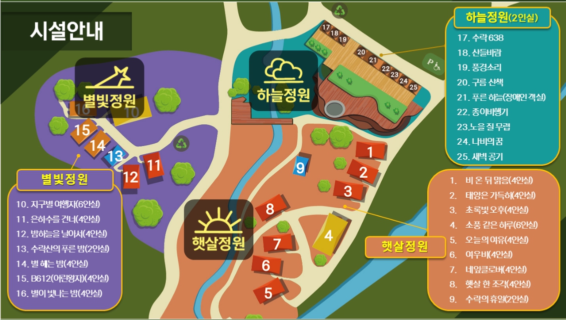 - 4인실~6인실: 햇살정원, 별빛정원, 트리하우스 등에 배치